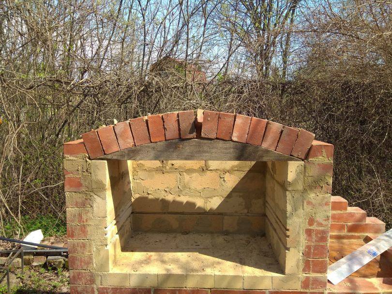 Через каждые два слоя кладку желательно перекладывать металлической сеткой для большей прочности сооружения. После семи уровней выполняется перекрытие. Далее продолжается кладка еще в три ряда. Последние ряды предназначены для организации зоны гриля. В конструкции следует оставлять небольшие зазоры, обеспечивающие поступление воздуха для горения.
