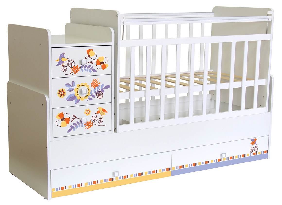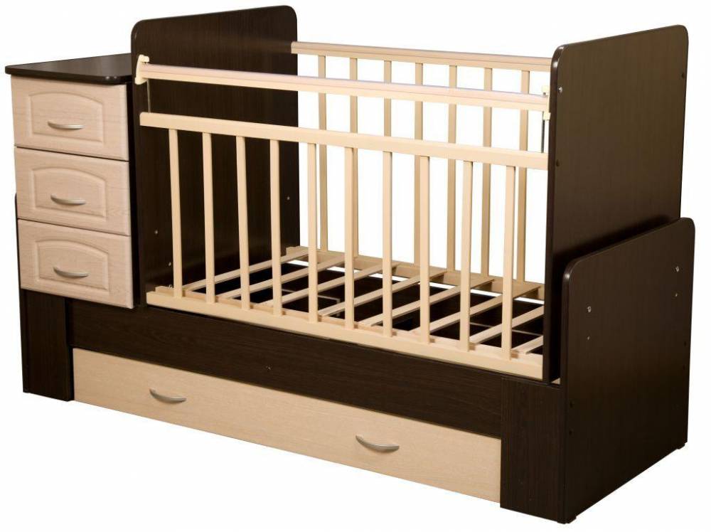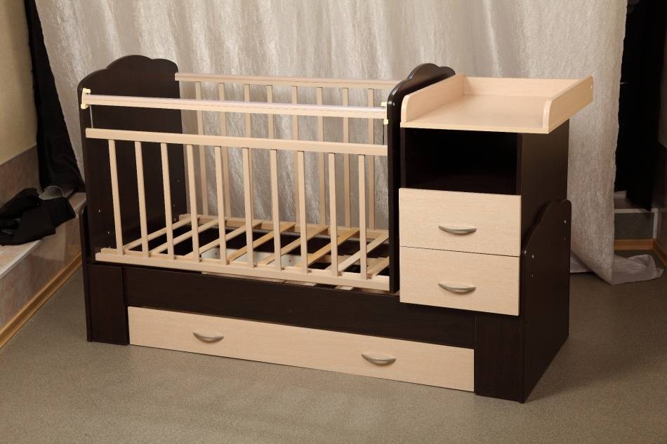 Кровать-трансформер — это модель столика 3 в 1. Это и кроватки, и пеленальный столик, и комод с выдвижными ящиками. Большинство молодых семей отдают предпочтение именно этой модели. Хотя стоимость высока, но оправдана.