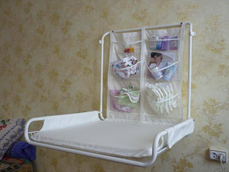 Подвесной пеленальный стол для новорожденного прикрепляется к стене и откидывается по мере необходимости. Он эргономичен, занимает мало места. Для хранения детских вещей к нему могут быть приделаны кармашки.