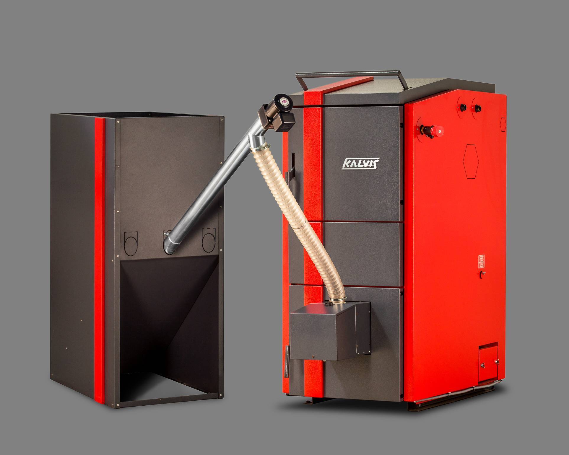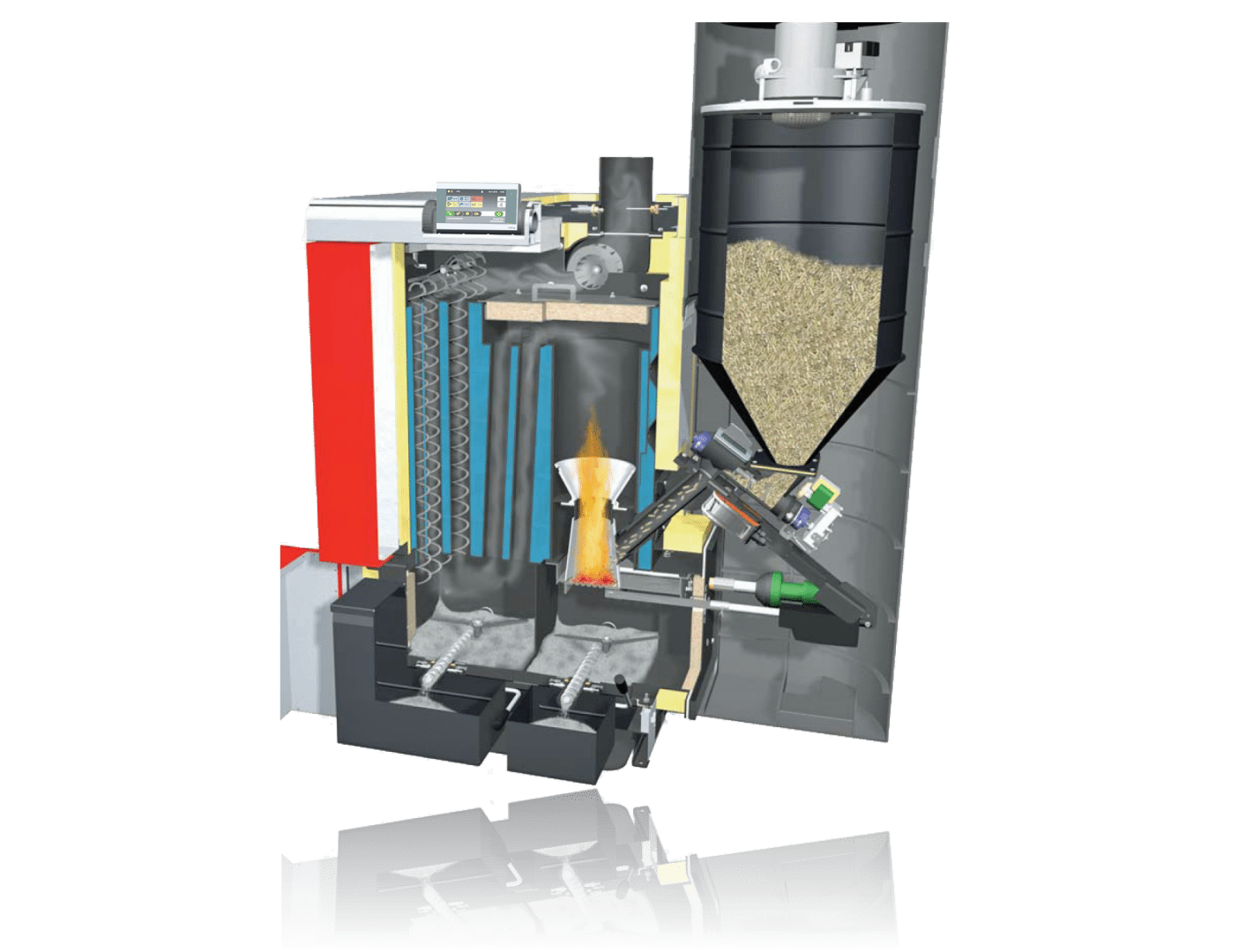 Пеллетные котлы бывают одно- и двухконтурными. Бункер для топлива располагается с наружной стороны агрегата, но есть модели с внутренними емкостями.