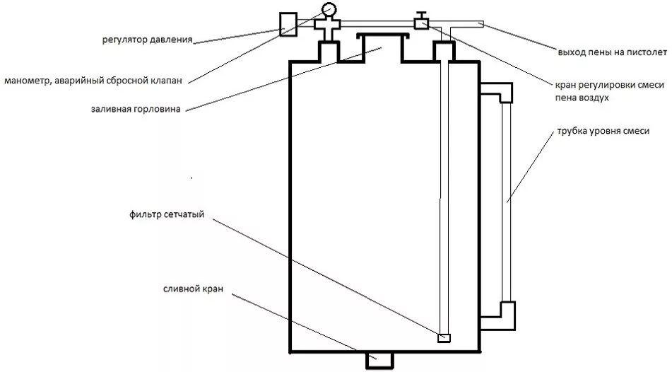 Выбор типа пеногенератора для самостоятельного построения производится исходя из наличных производственно-хозяйственных потребностей, сосуда для расходного и допустимых затрат на создание установки (см. также рис.):