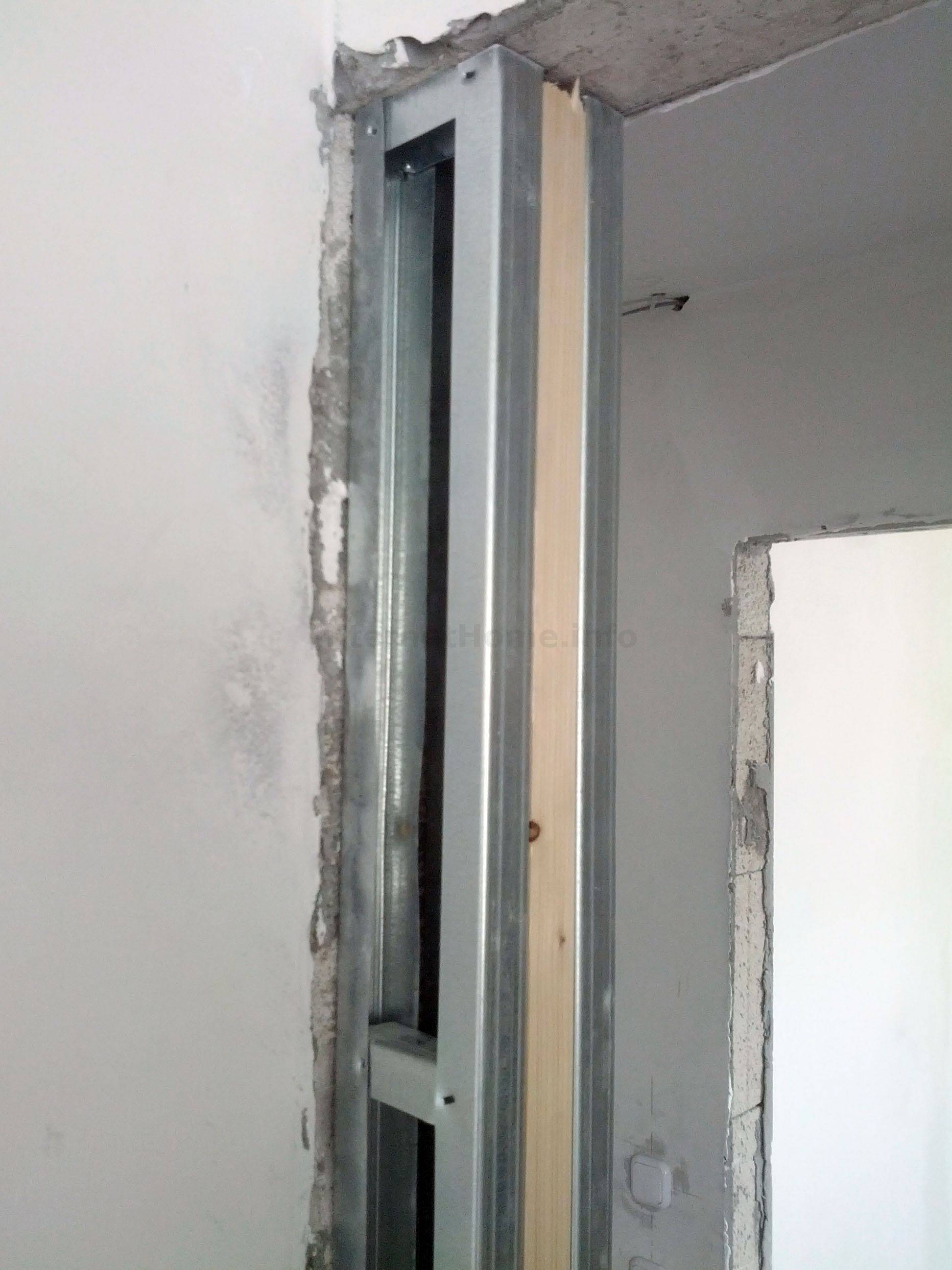 Дверь около стенки. В этом способе монтируется сплошной металлический профиль до проема с одной стороны