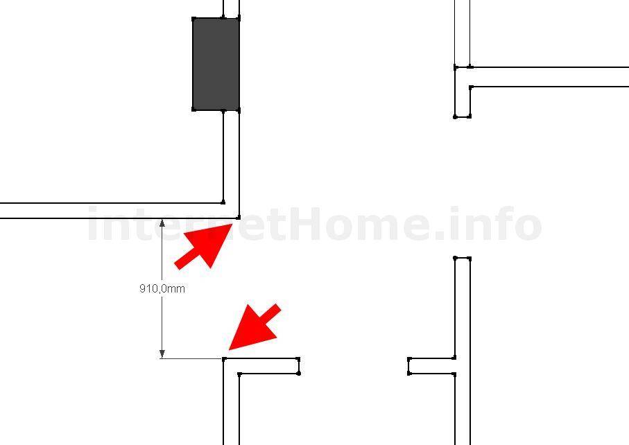 Что мы имеем, вход в помещение стандартного размера 910 мм, план показан на рисунке ниже. Красными стрелками указаны места где будут достраиваться пристенки из гипсокартона.