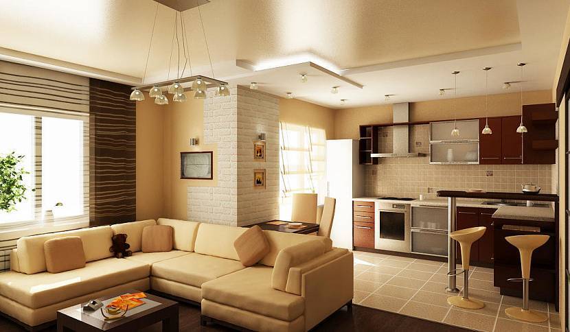 - Как правило, при разделении комнаты на кухню и гостиную приходится дополнительно продумывать обособленное освещение, а это дополнительный труд, затраты на вызов мастеров, покупку приборов освещения и последующий ремонт стен либо потолка.