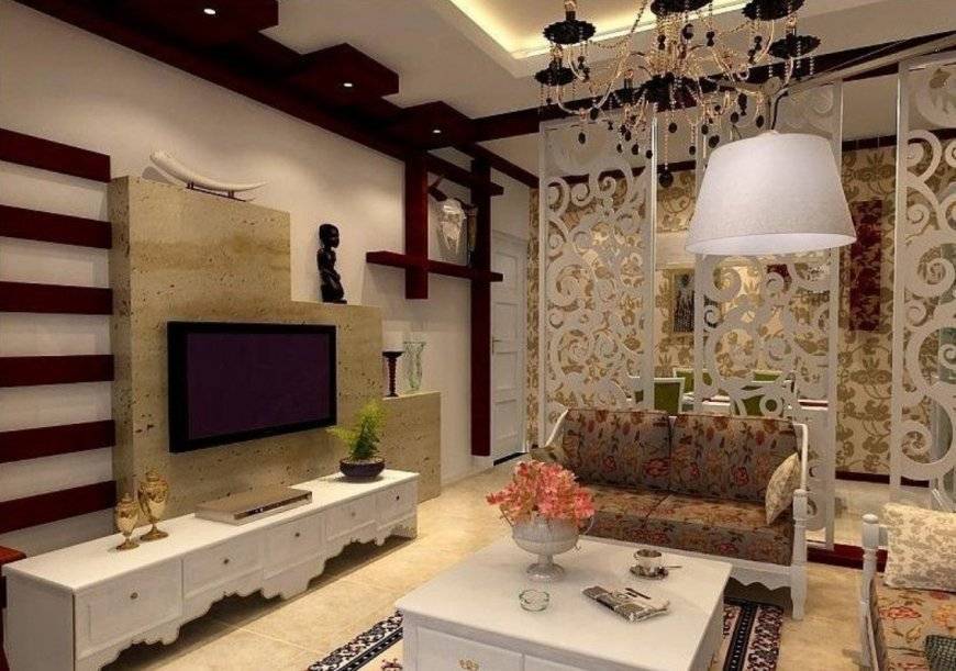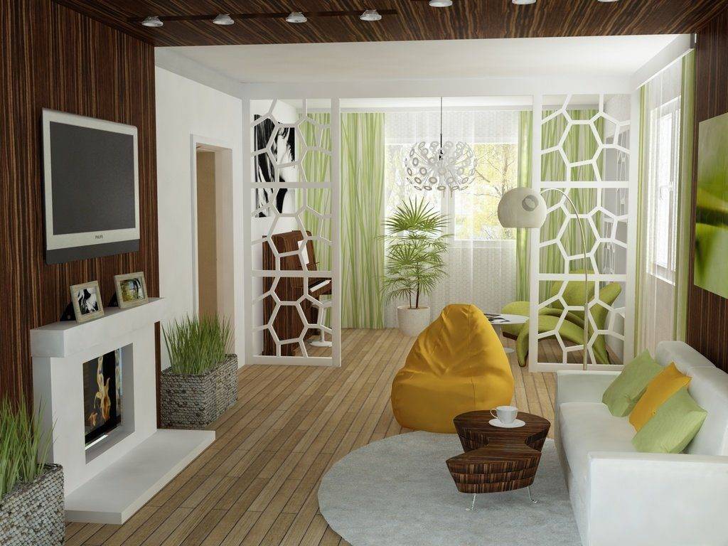 Дизайн гостиной с перегородкой такого рода никак не ограничивается. Оформить изделие можно самым разнообразным образом и превратить его в настоящее украшение интерьера.