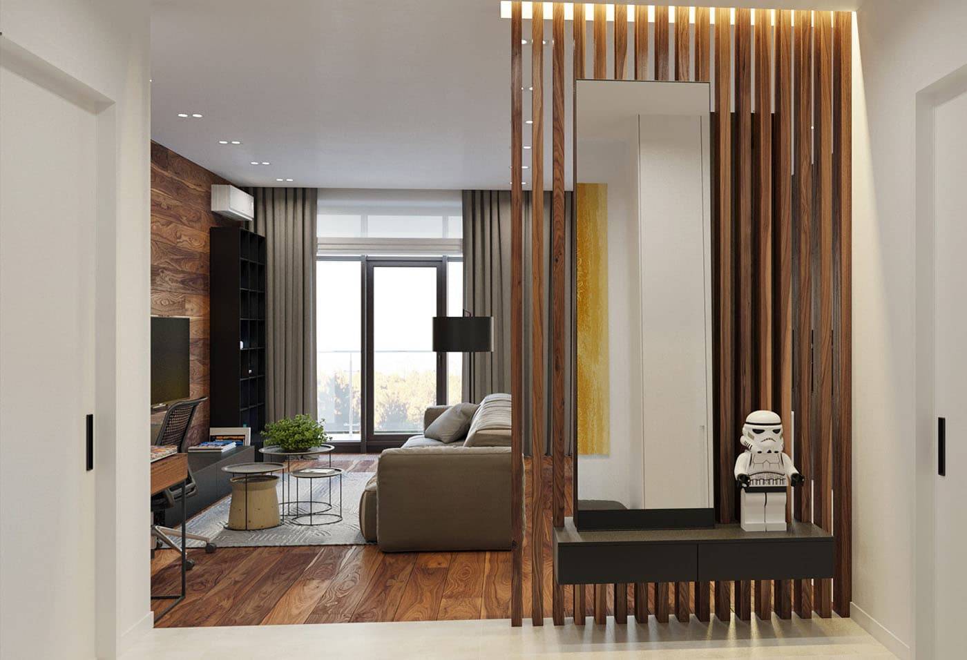 На фото прихожая, отделенная от гостиной с помощью распашного шкафа-перегородки коричневого оттенка.