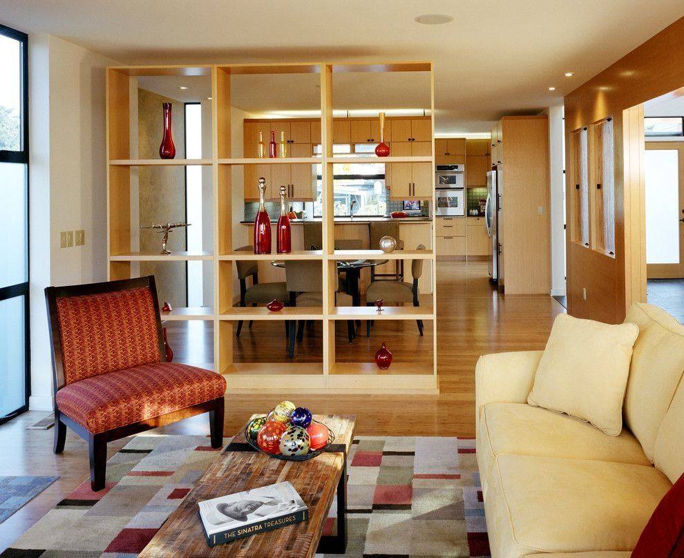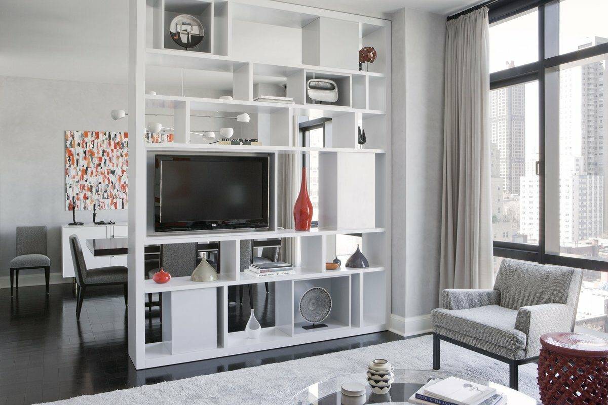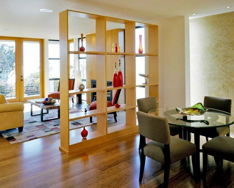 Функциональная перегородка уместна в маленьких помещениях. Она представляет собой вместительный стеллаж с многочисленными полками. Со стороны гостиной на полках могут преобладать книги, элементы декора, а со стороны кухни посуда.