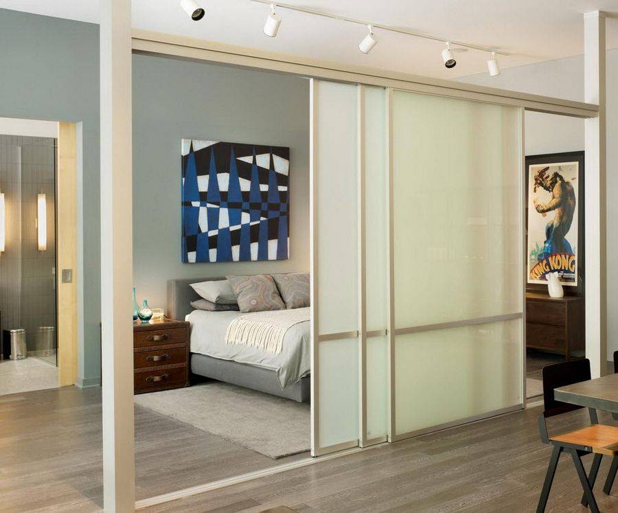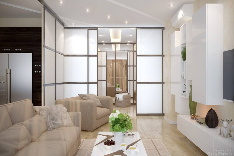 Раздвижная перегородка между кухней и гостиной – используется конструкция, аналогичная дверям шкафа-купе. В зависимости от величины проема двери могут устанавливаться непосредственно на стены и крепиться к потолку, или же отгораживать часть пространства и сочетаться с фальш-стеной, например.