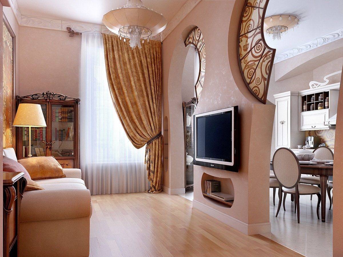 - Экономия на количестве телевизоров. Если бы кухня и гостиная отделялись обычной стеной, тогда есть необходимость устанавливать по телевизору в каждой комнате. При объединении этих комнат достаточно будет установить один большой телевизор в гостиной.