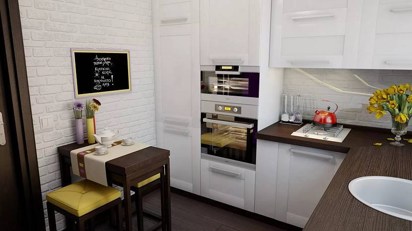 - Чтобы обстановка не выглядела монотонной, ее разнообразят вкраплениями ярких цветов — обивкой мебели, коллекцией чашек, контрастной столешницей. Плохое решение для маленькой комнаты — цветной потолок, уменьшающее ее высоту.