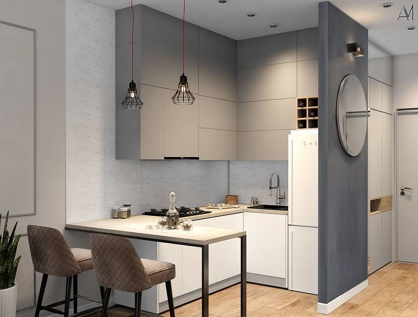 - Вам необходимо оформить стильную, но не слишком габаритную кухню в квартире студии.