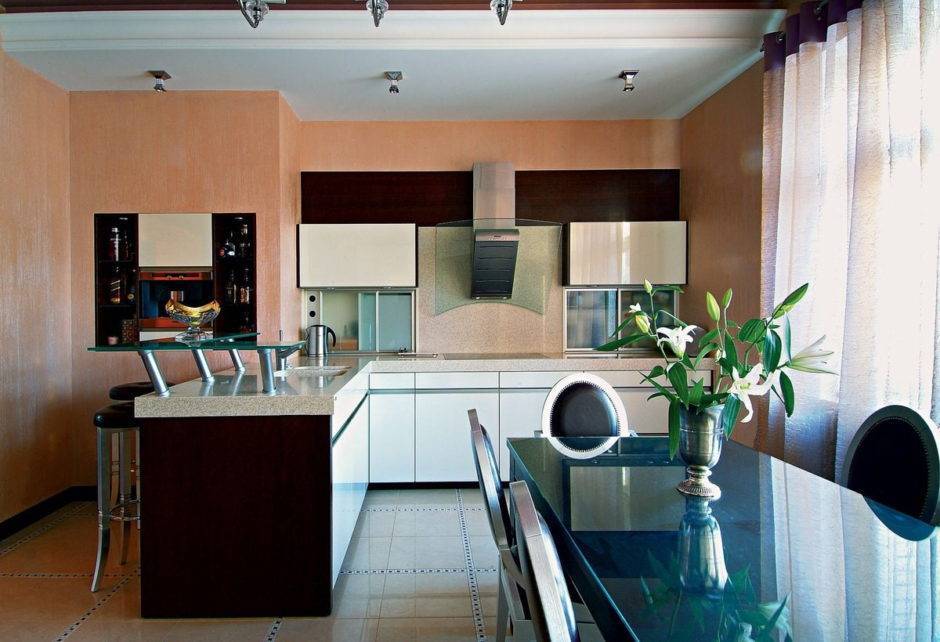 - Применять персиковые тона на кухне в виде обоев советуют в зоне отдыха. Оформлять стены рабочей зоны не стоит, потому что цвет является довольно марким, из-за чего на поверхности будет видна грязь и пятна.