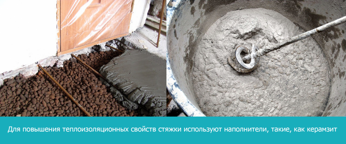 В качестве теплоизоляционного наполнителя, снижающего теплопроводность стяжки пола, можно использовать керамзит или вспученный перлит, однако, чем больше наполнителя, тем менее прочной будет стяжка. Кроме того, крупный наполнитель затрудняет формирование ровной поверхности пола.