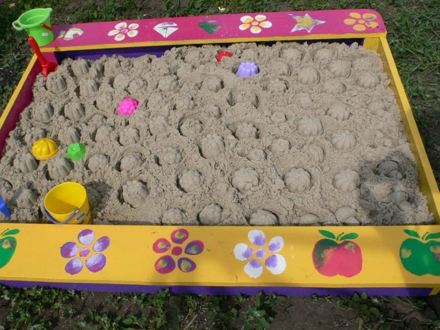 Слой песка для игры должен быть толщиной около 15 см; для заполнения стандартной песочницы его потребуется примерно тонна. Рекомендуется выбирать речной песок или кварцевый, который не слеживается. Перед засыпкой его обязательно просеивают через мелкое сито, чтобы убрать мусор, растительные примеси, насекомых.