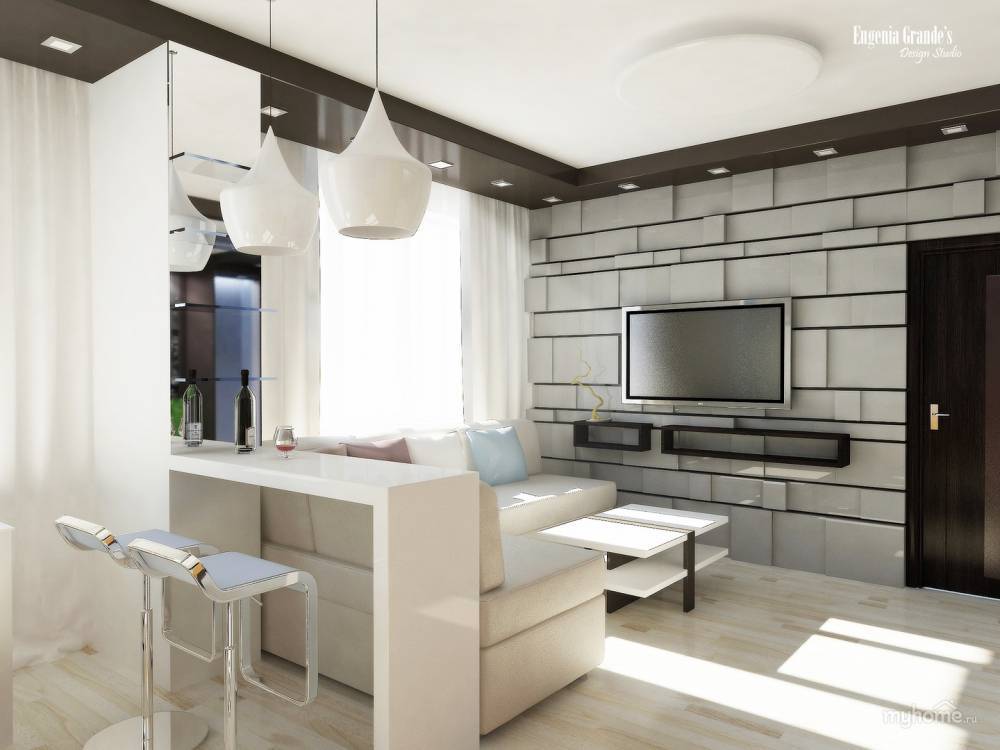 Основные несущие стены отделяют квартиры, поэтому можно демонтировать перегородочную стену в гостиную. Зонируют помещение, используя элементы мебели (барную стойку, диван), лёгкие перегородки из гипсокартона.