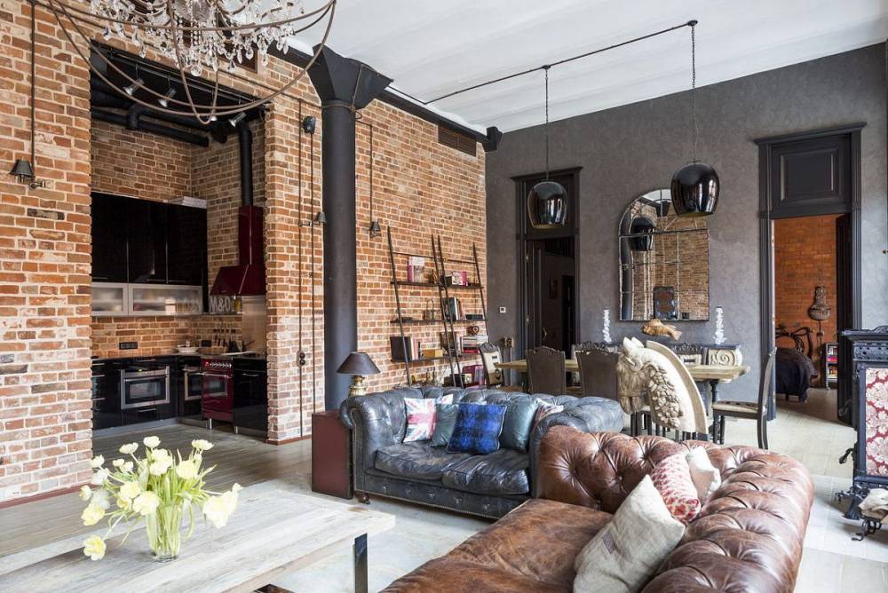 Стиль лофт традиционно подчеркивается искусственно состаренной кладкой из кирпича, потолочными вентиляционными коробами, а также окрашенными в стальной цвет батареями отопления.