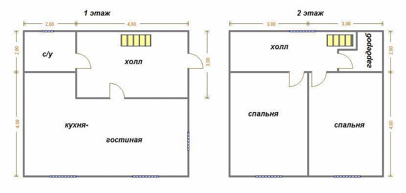 Расположение комнат на первом и втором этаже с отведением места для гардеробнойИсточник Domikbani.ru