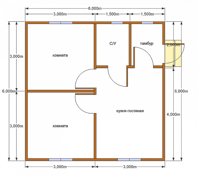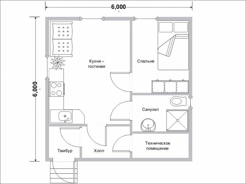 Одноэтажный дом площадью 6х6 имеет не так много вариантов планировки, как двухэтажные дома. Ведь на одной площади необходимо расположить все необходимые помещения и разделить их тонкими перегородками.
