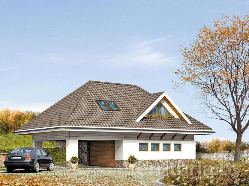 При этом на первом этаже предусмотрено место для автомобиля, а под крышей находится жилая зона.