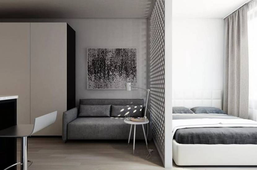 Спальня – гостиная, оформленная в минималистическом стиле, идеально подходит для небольшого помещения. Стиль минимализм предназначен для создания функционального пространства с несколькими зонами. При этом помещение будет выглядеть просторным и светлым.