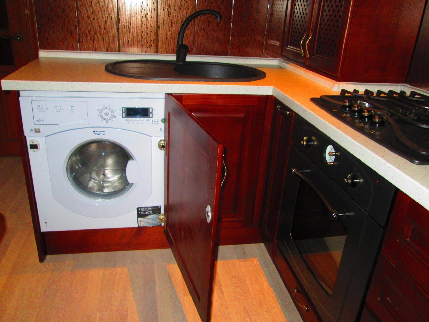 Минимальное расстояние между ними должно быть 15 см, но в идеале 40 см. Крайний шкаф для установки стиральной машины тоже нежелателен. Крепление будет ненадежным за счет крепежа только с оной стороны. Техника может быть как встроенной, так и располагаться под столешницей, не имеющей дворцов.