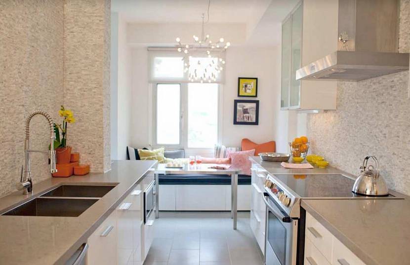 Декоративное оформление двухрядной кухни маленьким столикомИсточник ru.mehomez.com