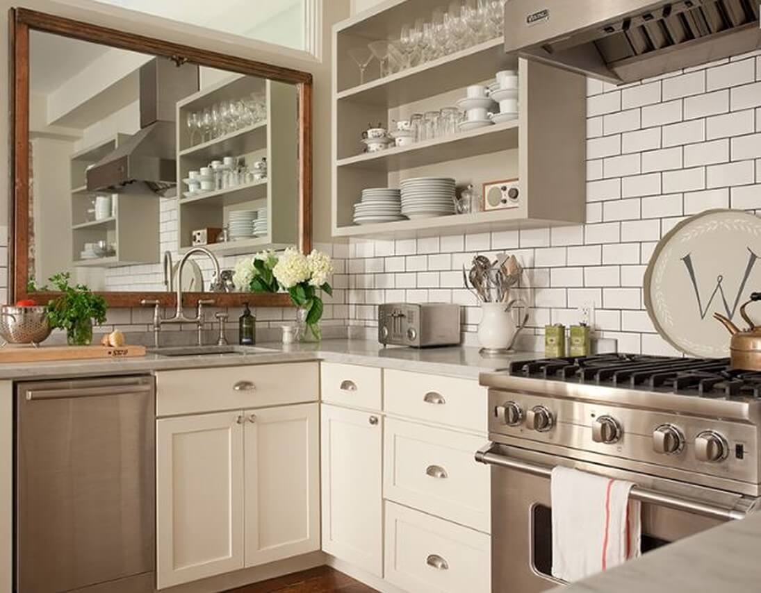 Актуальными на стенах маленькой кухни окажутся и зеркала. Не обязательно приобретать огромную модель на всю стену. Создайте оригинальную композицию из нескольких небольших зеркал.