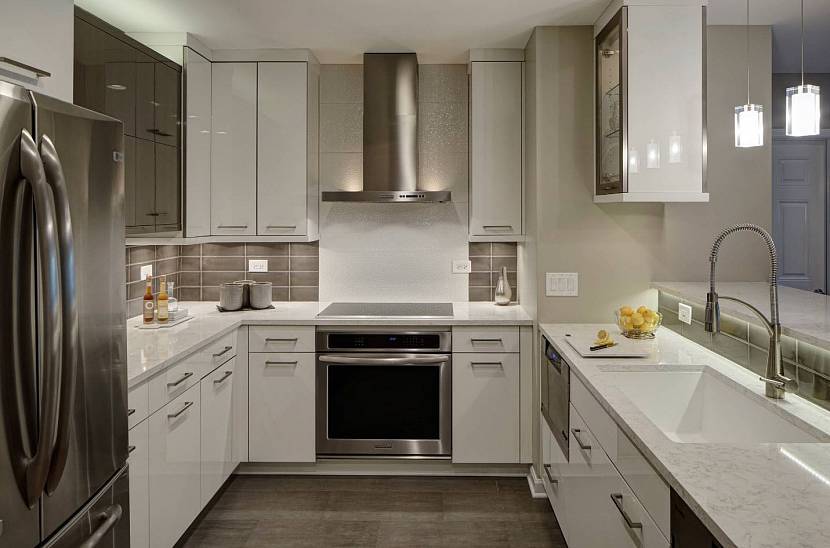 Увеличить пространство визуально помогут зеркальные, стеклянные и глянцевые поверхности, используемые в фасадах гарнитура, при обустройстве кухонного фартука и даже столешниц.