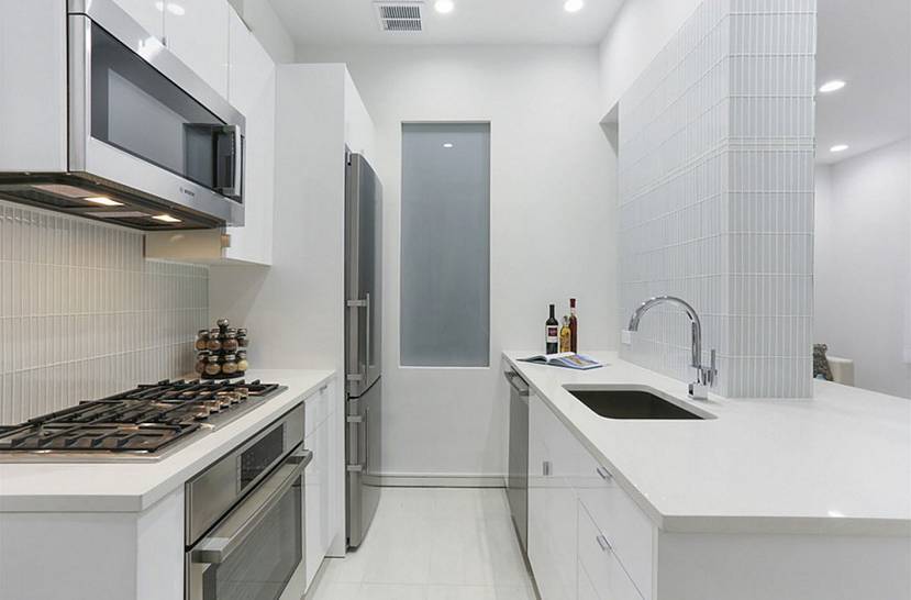 Двурядная кухня — это аналог линейной. В случае подобного оформления бытовая техника и шкафчики находятся симметрично друг другу. Верхняя часть чаще всего дублируется, но может быть закреплена только на одной стороне.