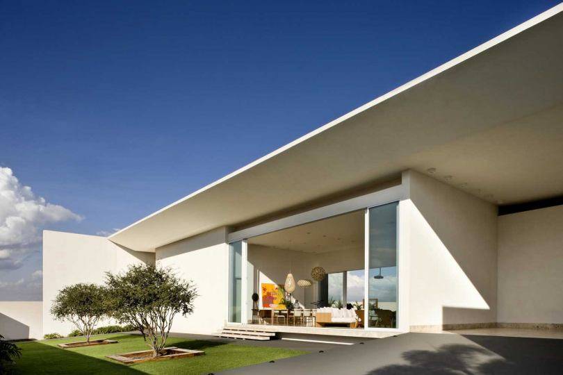 На входе в резиденцию расположен прямолинейный павильон, в котором размещаются комнаты для гостей, мастерская и гараж, а также домашний кинотеатр (который занимает место, изначально предназначенное для игровой комнаты). Два коридора соединяют этот павильон с социальным и праздничным блоком. Столовая и гостиная в полном визуальном контакте с окружающей природой, благодаря стеклянным крышам.