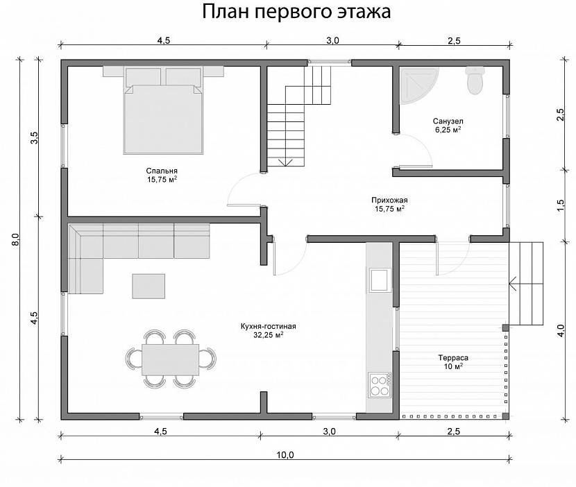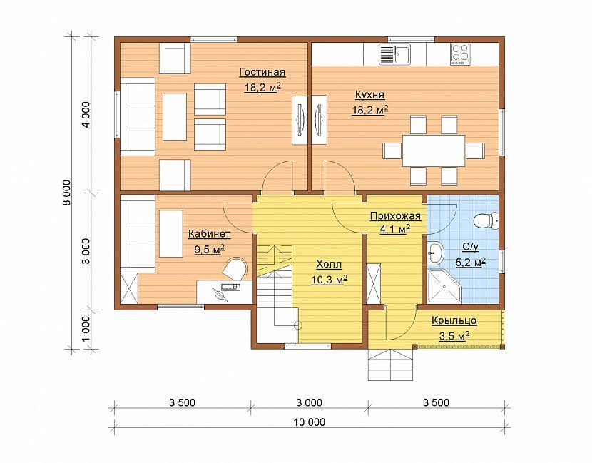 В доме со сторонами 8х10 метров очень удобно размещать не только функциональные помещения, но и продумать гардеробную, кладовую или подвал. Все это легко разместить при рациональном планировании перегородок.