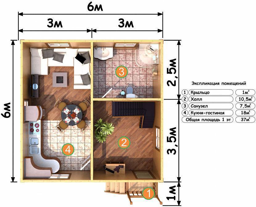 Планировка дома с размерами 6х6 метров получается небольшой. Но ее можно сделать довольно функциональной, если обустроить несколько полезных комнат: кухню, гостиную и прихожую.