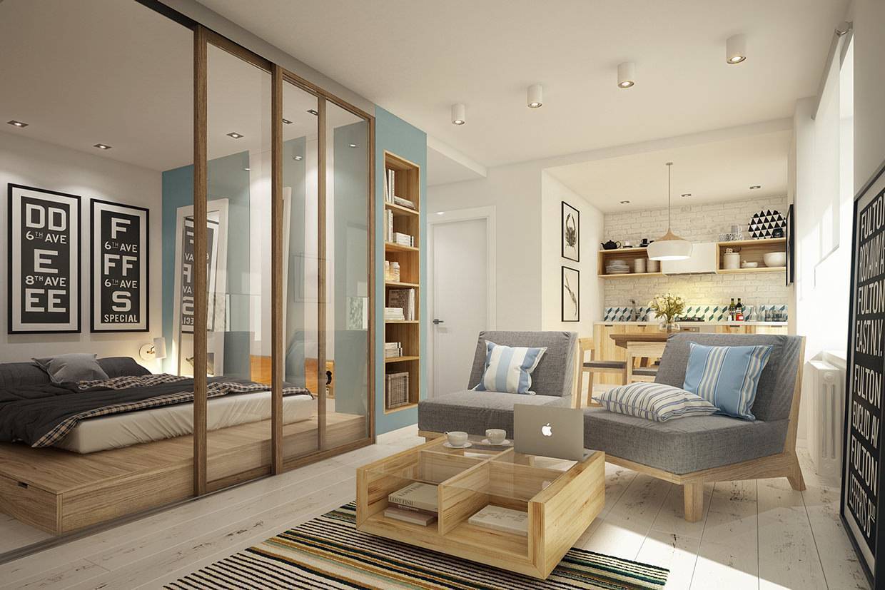 При перепланировке малогабаритки можно сделать квартиру-студию. Зона для приема гостей и отдыха отделяется от кухни передвижной перегородкой. Стеклянная, витражная и зеркальная ширма будет красиво смотреться, зрительно увеличивать пространство.Устанавливается барная стойка, которая делит площадь и используется в качестве обеденного стола.