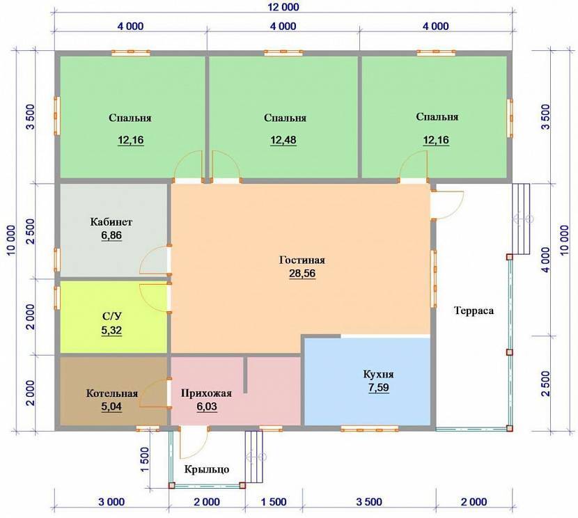 Планировка одноэтажных частных домов обычно подразумевает размер комнат от пола до потолка около трех метров. Это оптимальный вариант, который будет максимально практичным и комфортным.