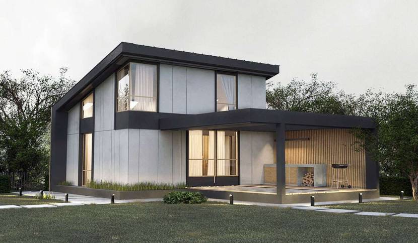 Чтобы создать ощущение легкости в дизайн фасада дома, используйте контрастный цвет. Второй этаж оформить светлыми тонами, а нижний – темными. Интересной деталью экстерьера является сочетание панелей разного размера.