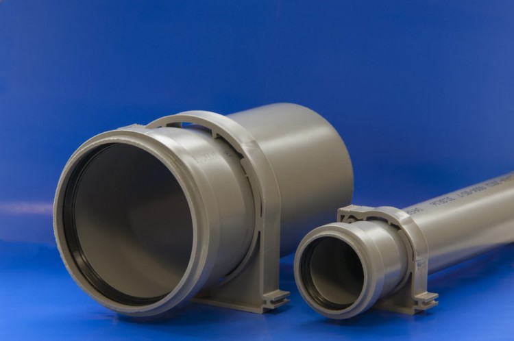 ПВХ фитинги для монтажа внутренней канализации имеют диапазон диаметров от 50 до 200 мм. Для крепления труб на стенах применяются пластиковые хомуты, которые усаживаются на несущую конструкцию с помощью двух анкеров.