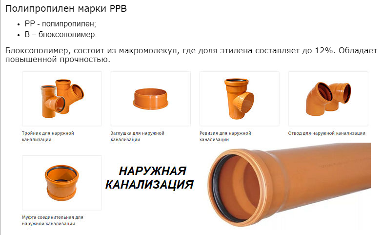 Для прокладки внешней канализации применяются оранжевые или коричневые трубы диаметром 110-150 мм, длиной 500-2000 мм. Выпускаются также комплектующие соответствующих окрасок.