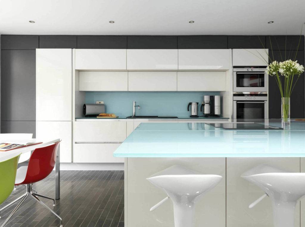 Стекло – дорогой и хрупкий материал, поэтому столешницы из него можно увидеть на кухнях довольно редко. Они прозрачны и очень эффектны, вписываются в современные, необычные интерьеры.
