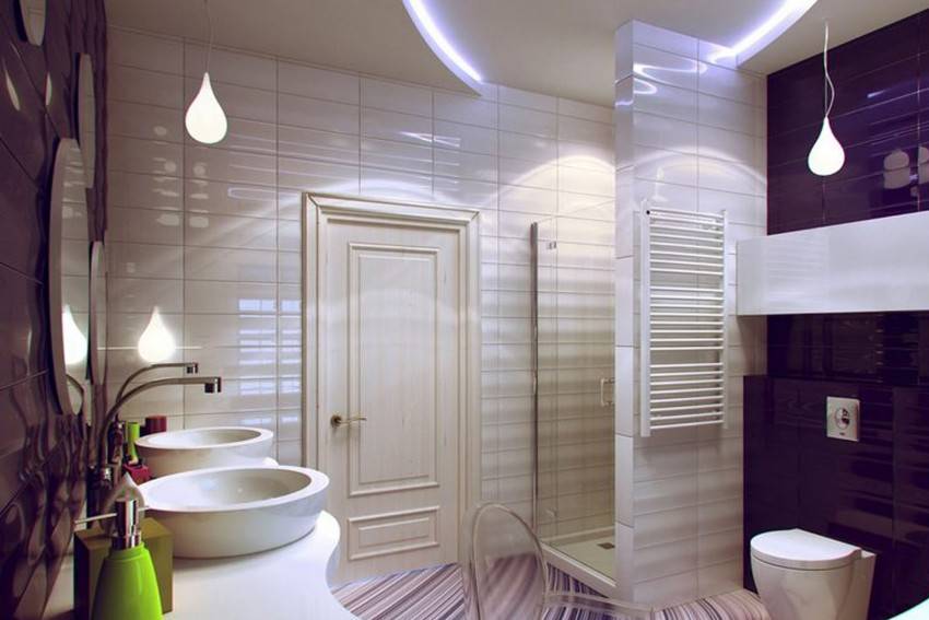 В ограниченном пространстве ванной не принято использовать сложные приемы дизайна. Но, если позволяет площадь, высота стен и бюджет, в ход идут более сложные варианты потолков в ванной комнате:
