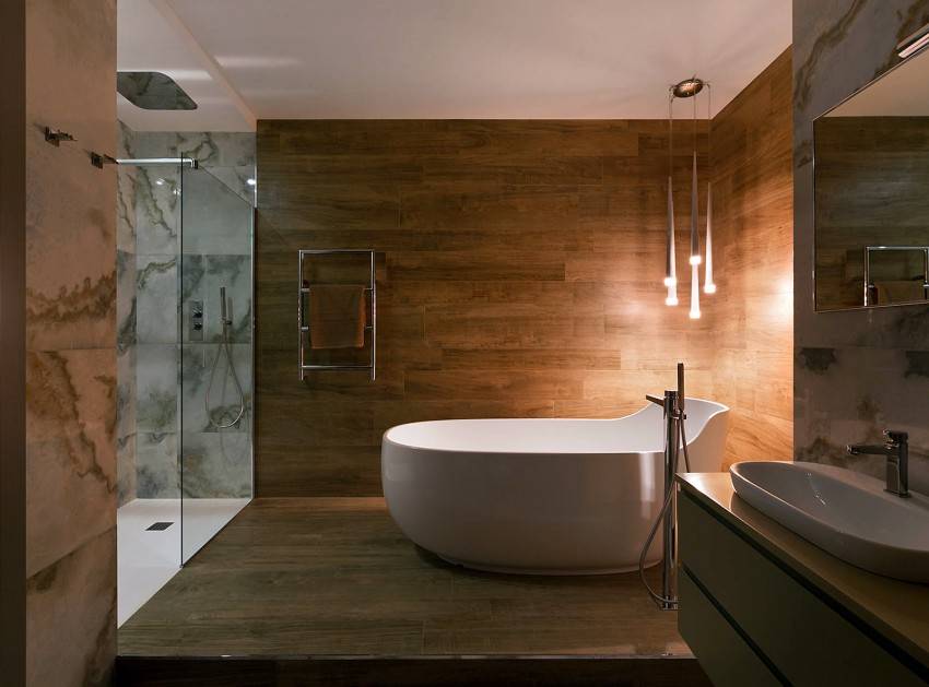 На фото эффектно смотрится в ванной крупная настенная керамическая плитка прямоугольной формы, при горизонтальном ее расположении, например, стандартных размеров 600X400 или 600X300 мм. Квадратная плитка имеет самые распространенные стандарты размером 150X150, 300X300, 450X450 мм.