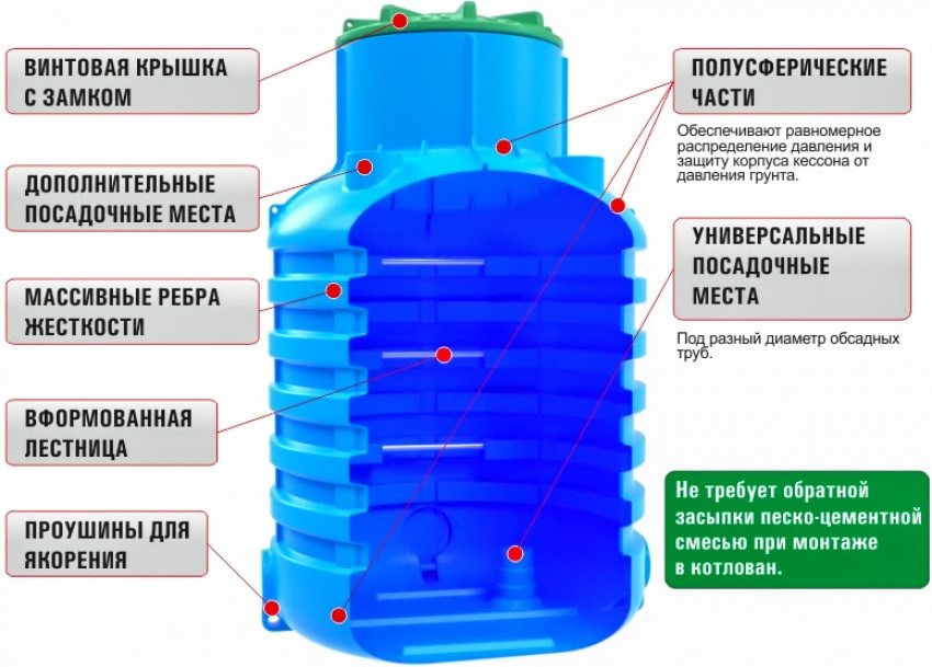 Вверху резервуар имеет суженную горловину, которую герметично закрывают полимерной крышкой. Стенки кессона оборудованы ребрами жесткости, внутри камер имеется вмонтированная лестница для спуска и подъема человека. Дно емкости оснащено отверстием или подгоняемым полимерным пеналом под разные диаметры обсадной трубы, на которую при монтаже одевают колодец.