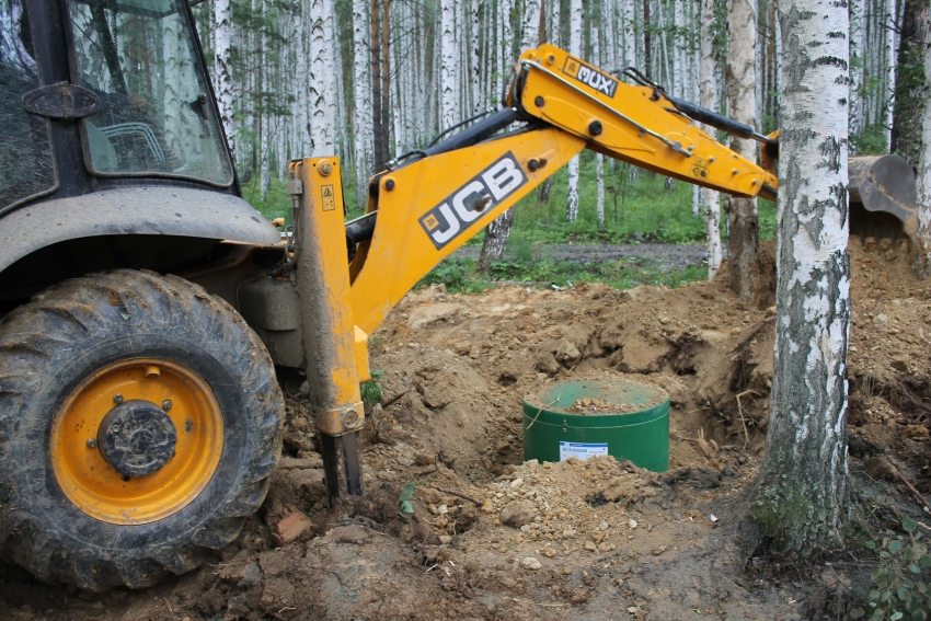 Котлован под конструкцию выкапывают больше ее самой минимум на 30 сантиметров, что помогает установить ее максимально точно, корректируя место совпадения трубы источника воды с гильзой для ее проведения