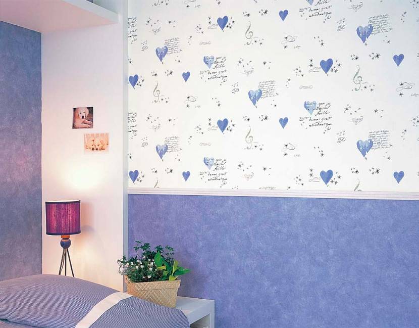 Зонирование, выполненное не в пространственном формате, а в качестве отделения двух разных вариантов облицовки стен. В данном случае: комбинация обоев (верх) и декоративной штукатурки (низ).