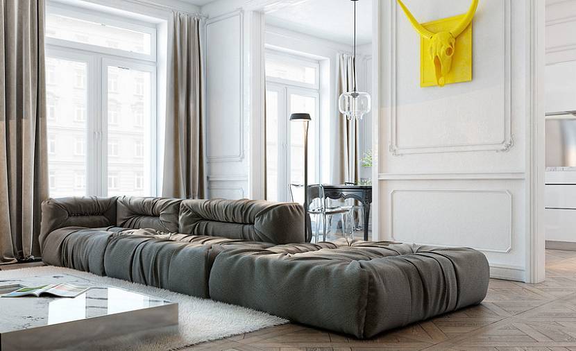 Создание гармоничного пространства лежит через объединение молдингов с окружающей обстановкой. Рассмотрим это на примерах интерьера гостиной: