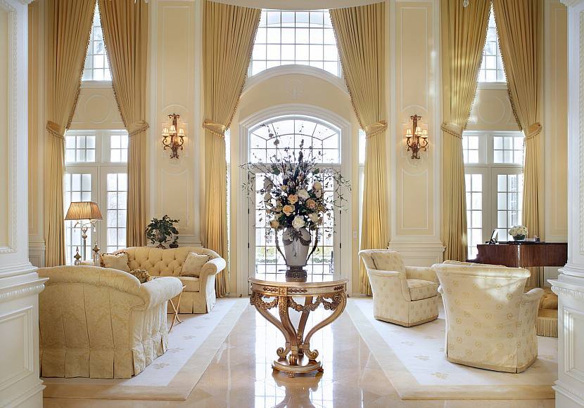 В высоких помещениях пенопластовая мелочь не смотрится совсем. Здесь нужны широкие полиуретановые или дюрополимерные изделия: габаритные, заметные, статусные. Желательно с множеством декоративных завитушек. Только в этом случае они становятся значимым элементом в интерьере.