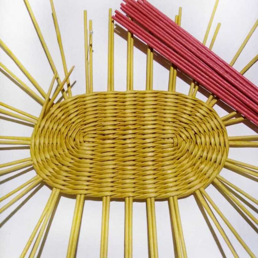Прежде чем начать переплет, нарисуйте на картоне схему для дна в виде солнышка, где окружность – основа, а лучики – количество спиц для ее расширения. Для «полной картины» разложите тростинки на эскизе и закрепите прищепками по краям картона;