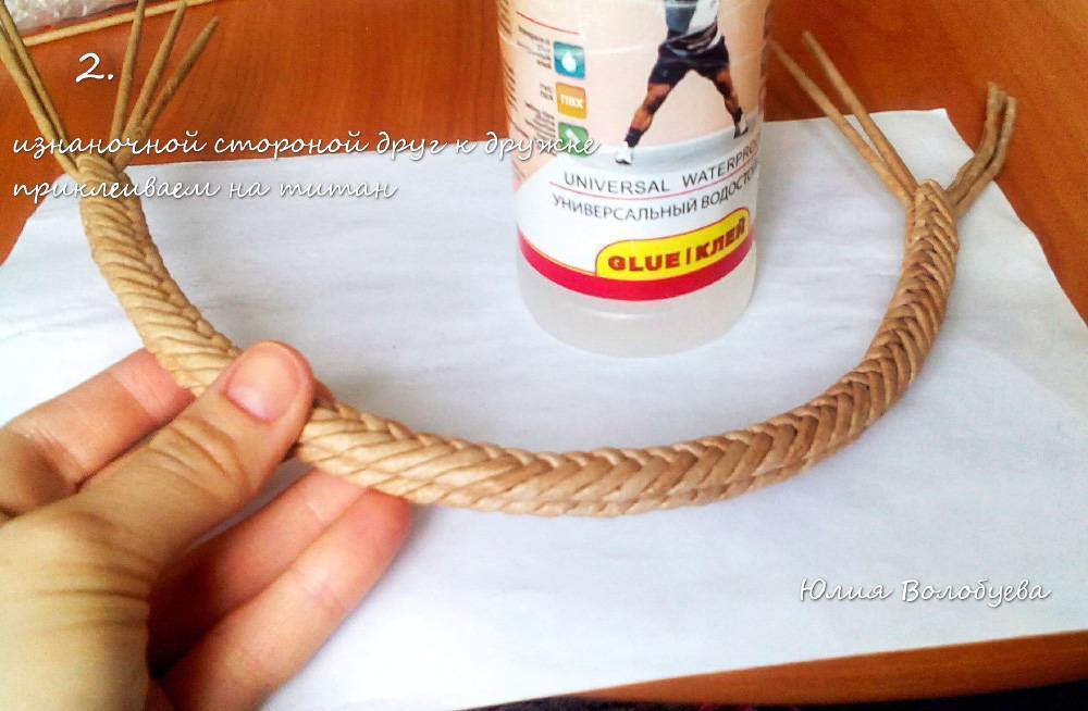 На двухсторонний скотч по всему диаметру расклей трубочки-стойки, количество которых нужно просчитать заранее. Залей все клеем по периметру, положи сверху вторую деталь дна и просуши под прессом. Чтобы начать плетение, вставь рабочую трубочку рядом со стойкой или соедини две и надень петлей.