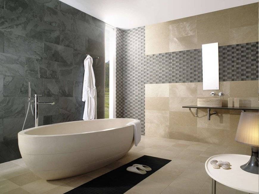 Кафельная плитка для ванной используется различных форм и размеров. Для пола подойдет крупный формат, для стен и ванны мозаика или среднего размера. Допускается сочетание нескольких размеров одновременно.