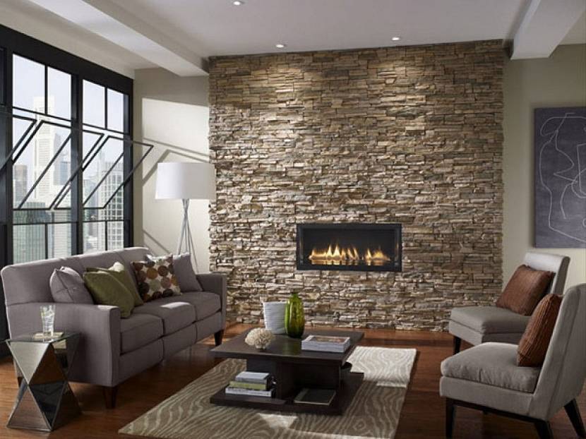 Оформить стены зала в «каменном» стиле – неординарное и самобытное решение. От того, какой выбран материал, зависит: