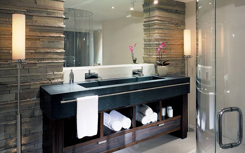 Используя богатую цветовую палитру предлагаемого декоративного камня для ванной, можно составить грамотный ансамбль: ванна-умывальник-этажерка-тумба для белья. Органично смотрится сочетание каменных стен с полом, выложенным метлахской плиткой.